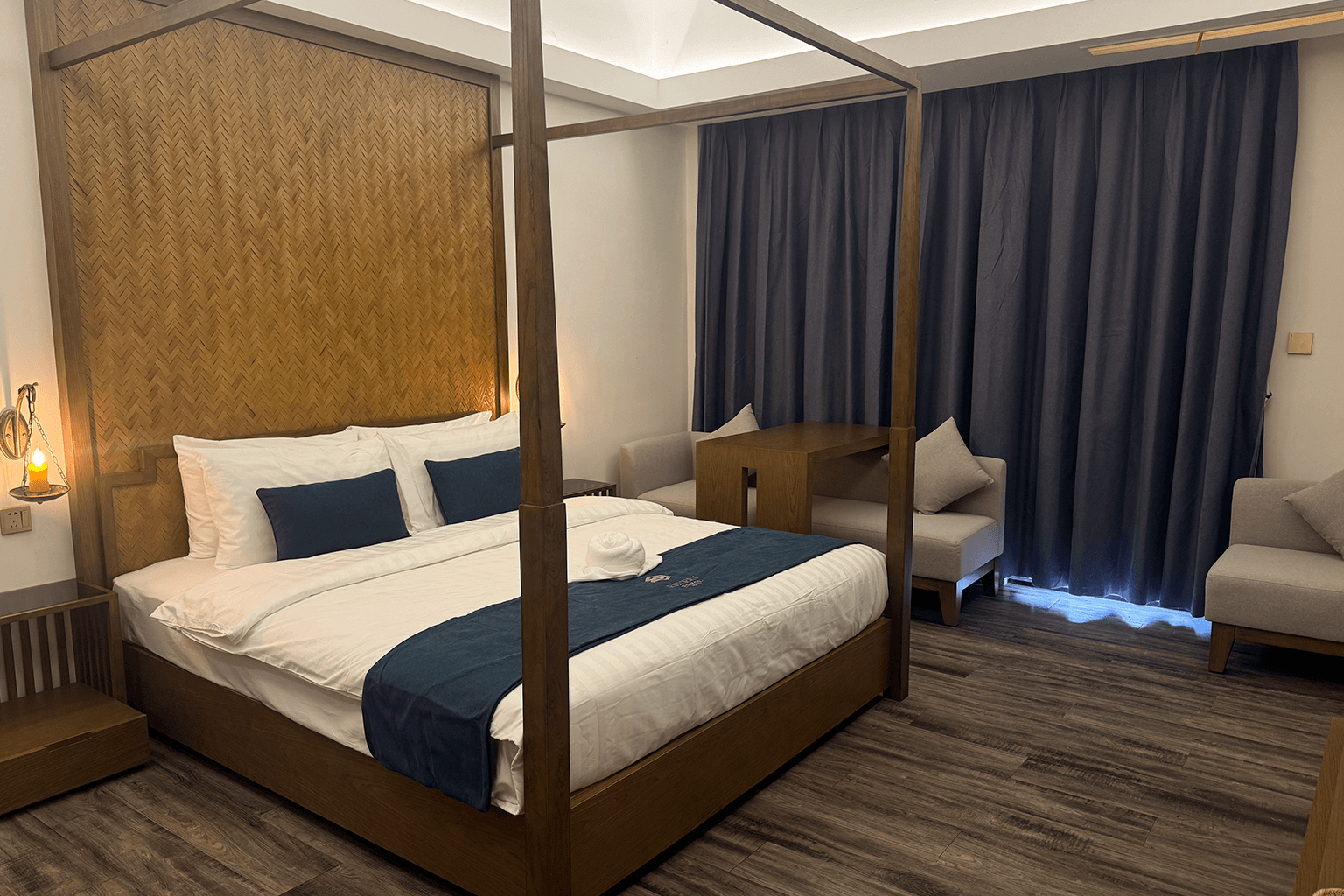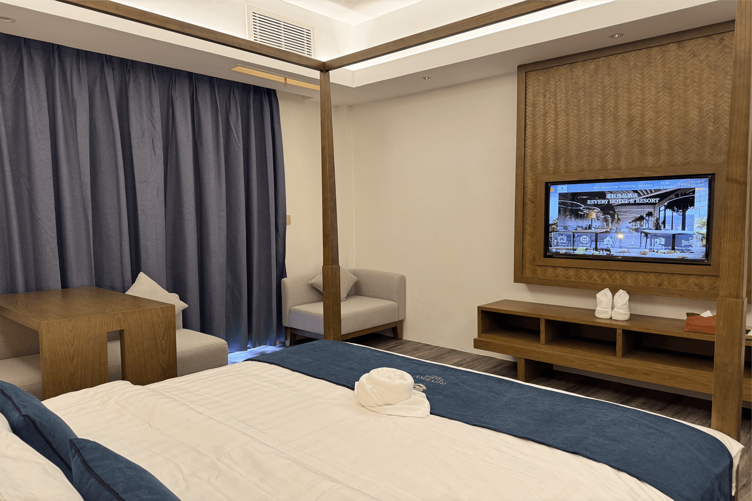 標準大床客房 色調柔和舒適的簡約風 戶外美景一覽無遺 讓您遠離塵世的喧囂